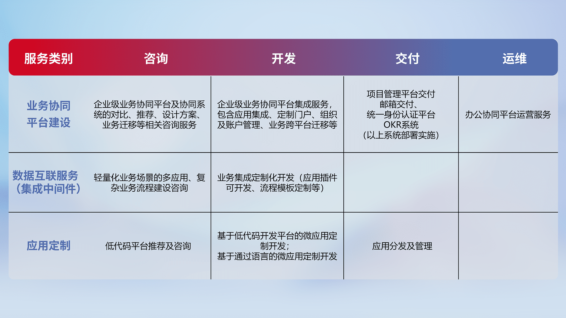 针对钉钉、、、、企微、、、、IDaas等平台级产品提供产品的规划、、方案、、交付、、定制化开发等服务,,,实现如统一协同办公、、、智能客户服务、、、混合会议管理、、智能数据查询、、等业务场景,,,实现数字化转型。。。。