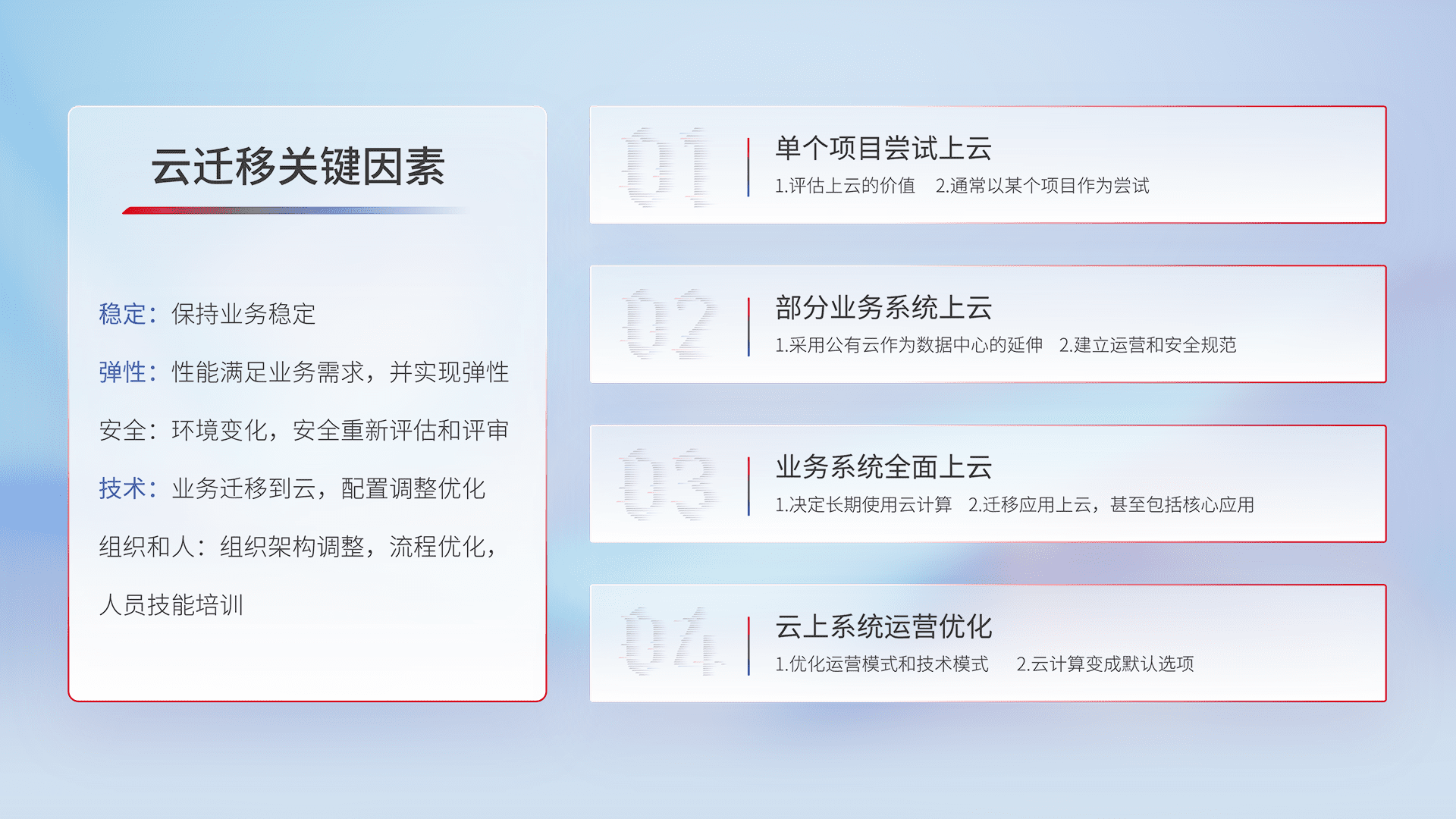 结合实际业务,,从规划设计、、、云平台选型、、、、云原生改造、、、数据迁移、、、、集成交付,,,,迁移全过程为客户识别最佳上云路径,,,做好风险识别管理,,设计网络架构、、、、身份权限、、、安全审计合规、、操作审计、、、、日志审计、、、监控告警策略、、、多站点容灾设计等,,,,对云上基础设施进行整体规划,,,提升IT治理水平,,,以满足弹性、、高可用、、高性能的需求。。。。